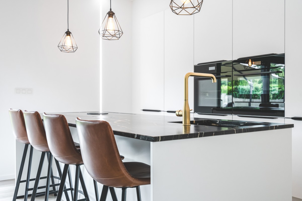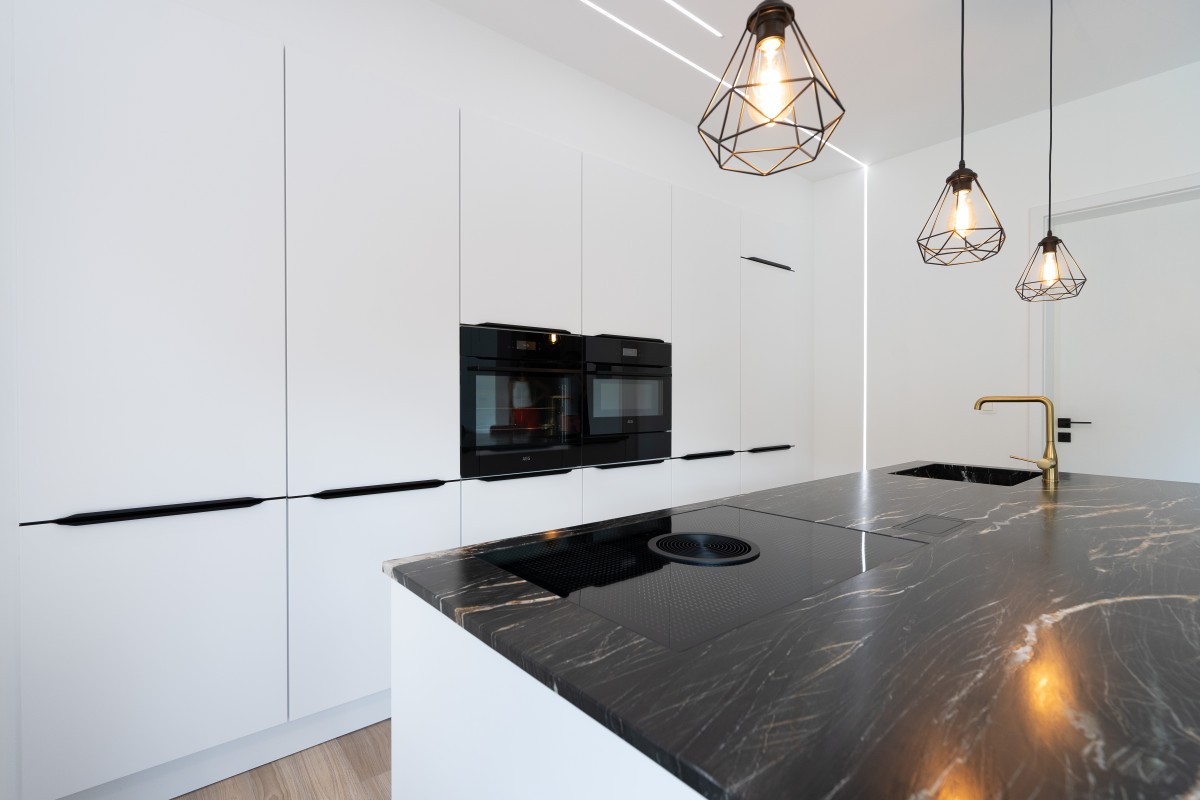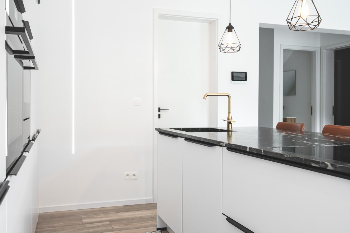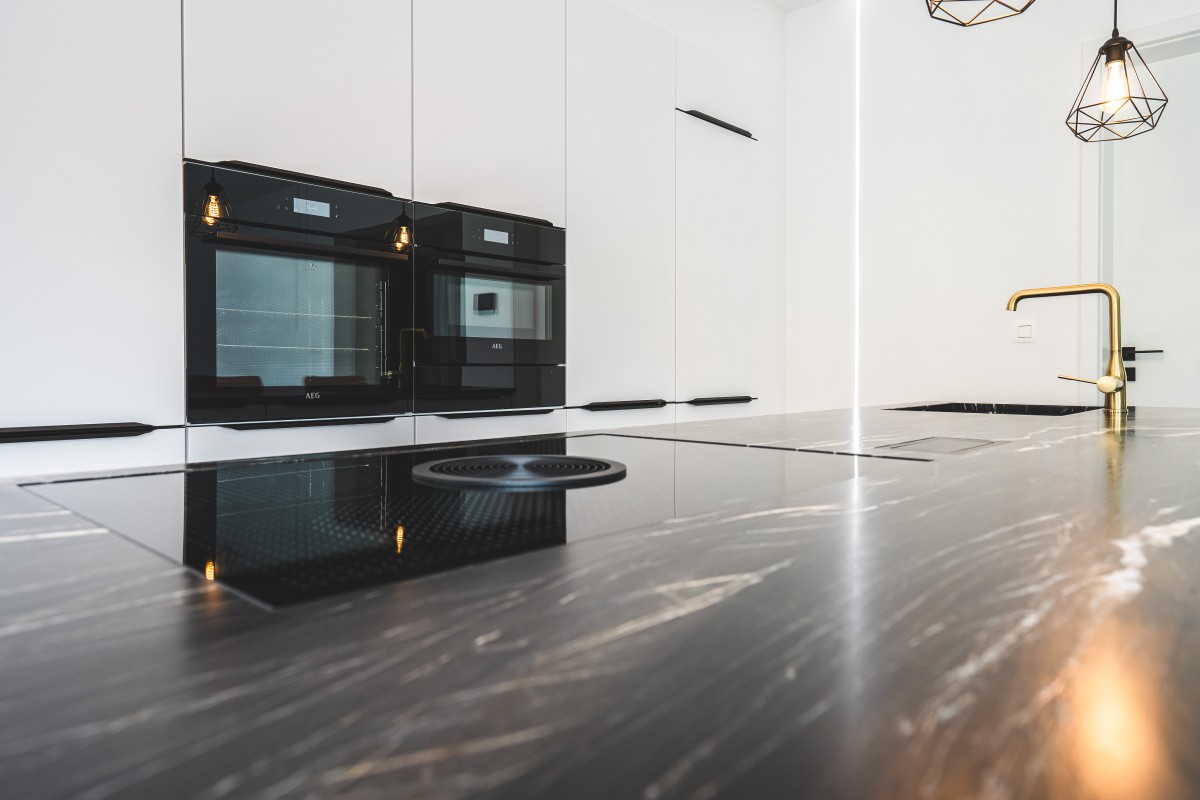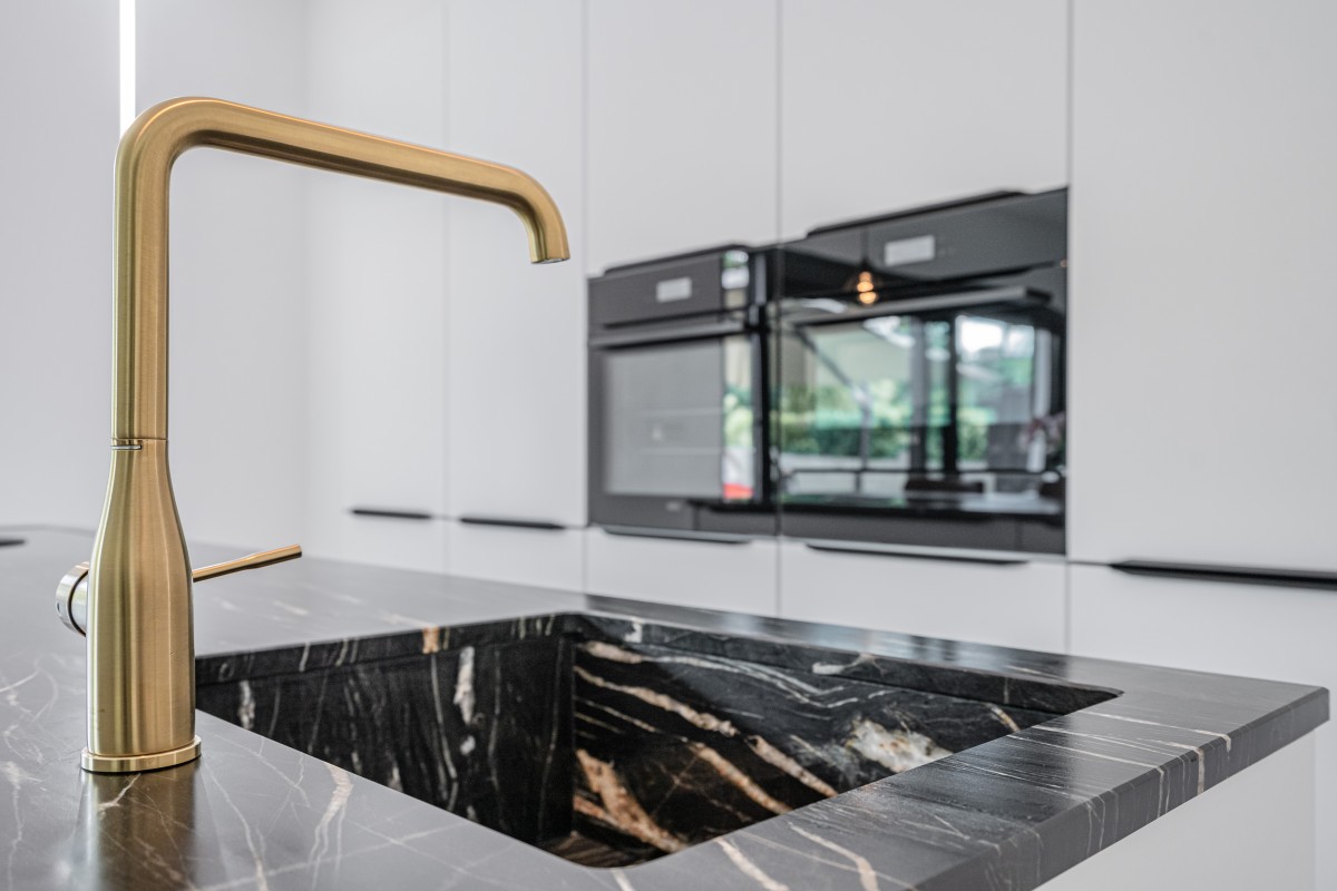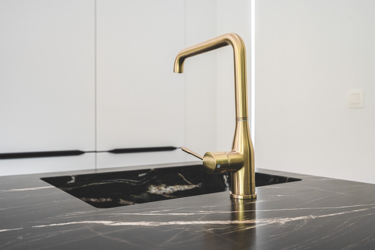 Sobriété et raffinement se rencontrent dans cette cuisine minimaliste, avec son plan en quartzite naturel et ses détails dorés qui illuminent l’espace