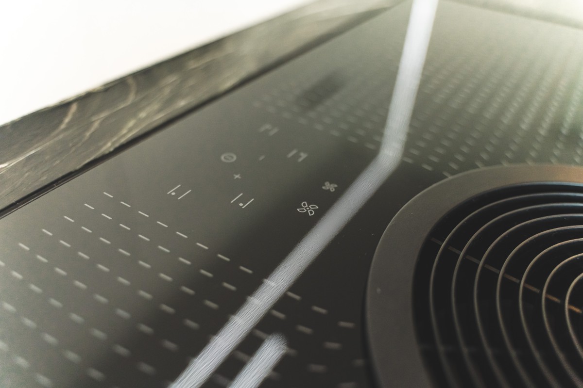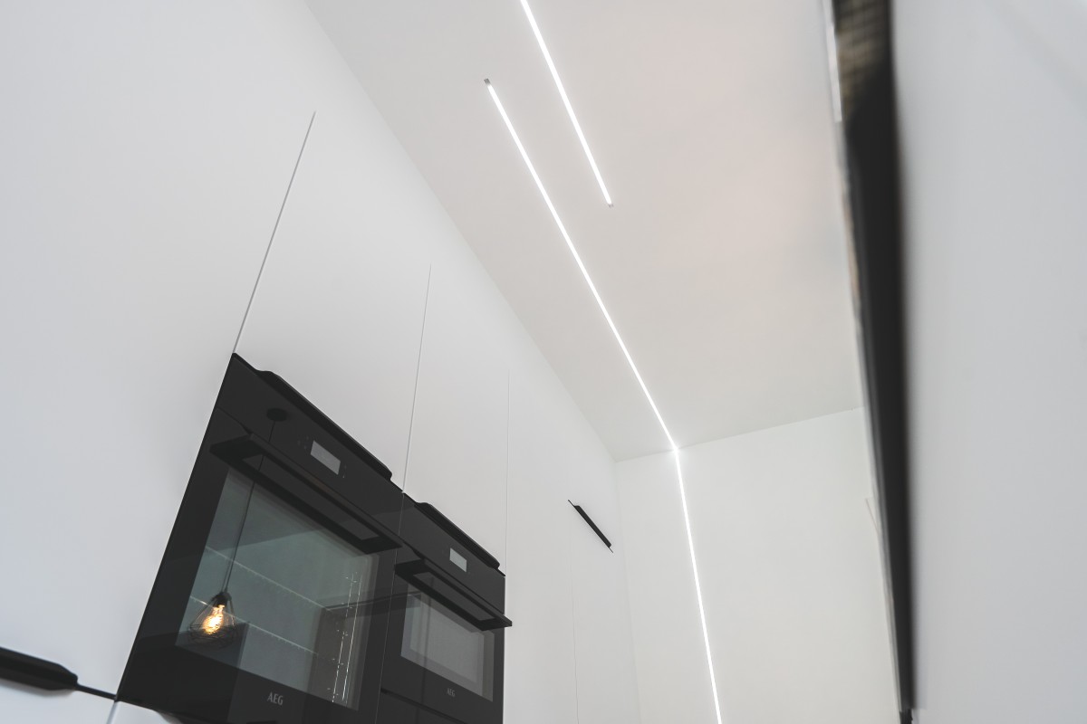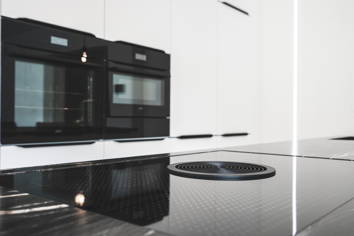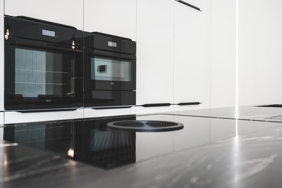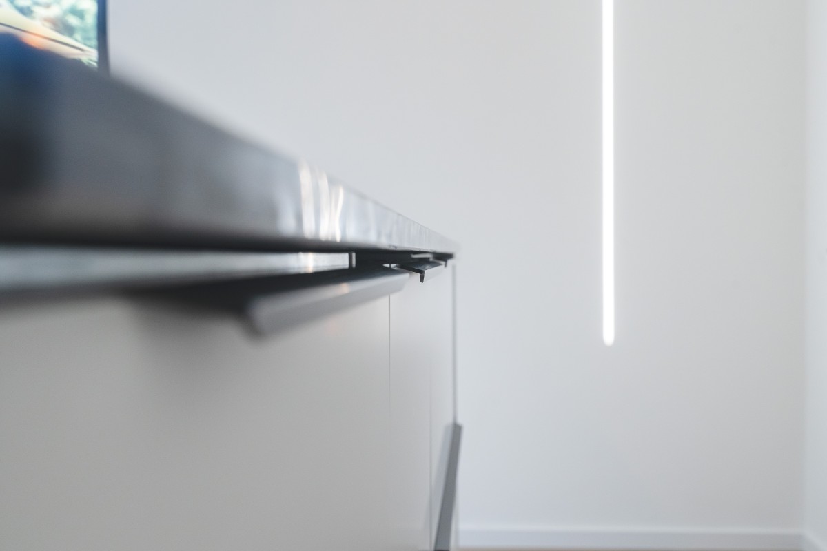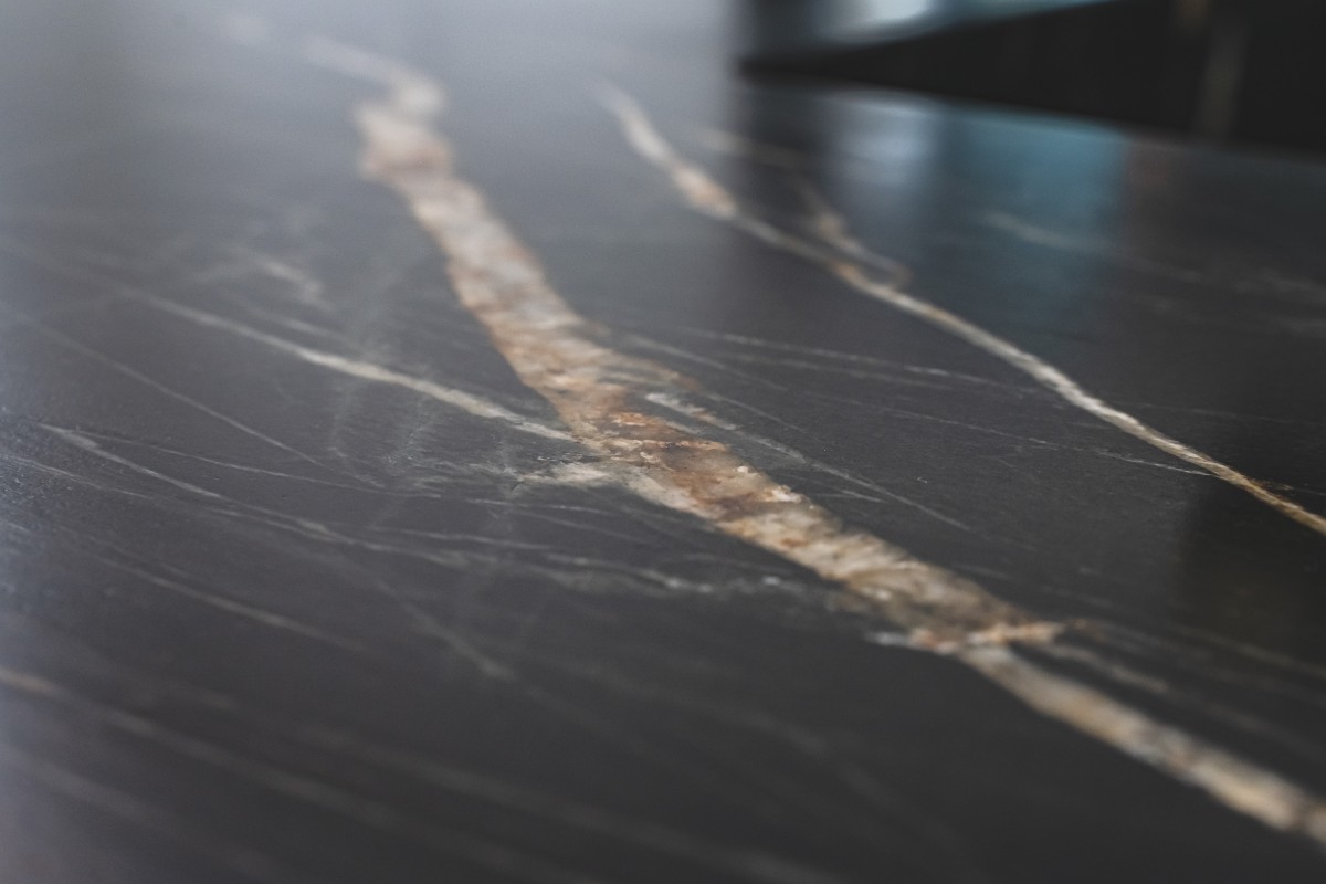 Sobriété et raffinement se rencontrent dans cette cuisine minimaliste, avec son plan en quartzite naturel et ses détails dorés qui illuminent l’espace