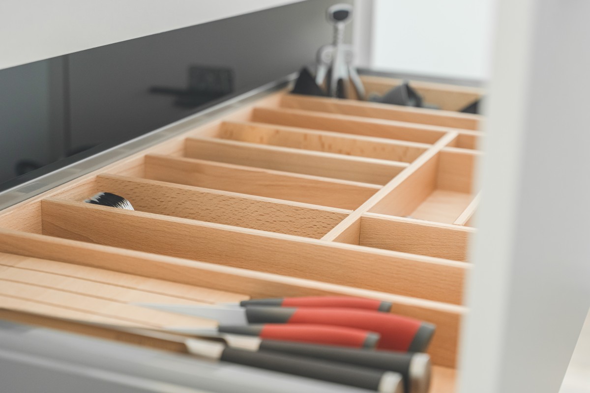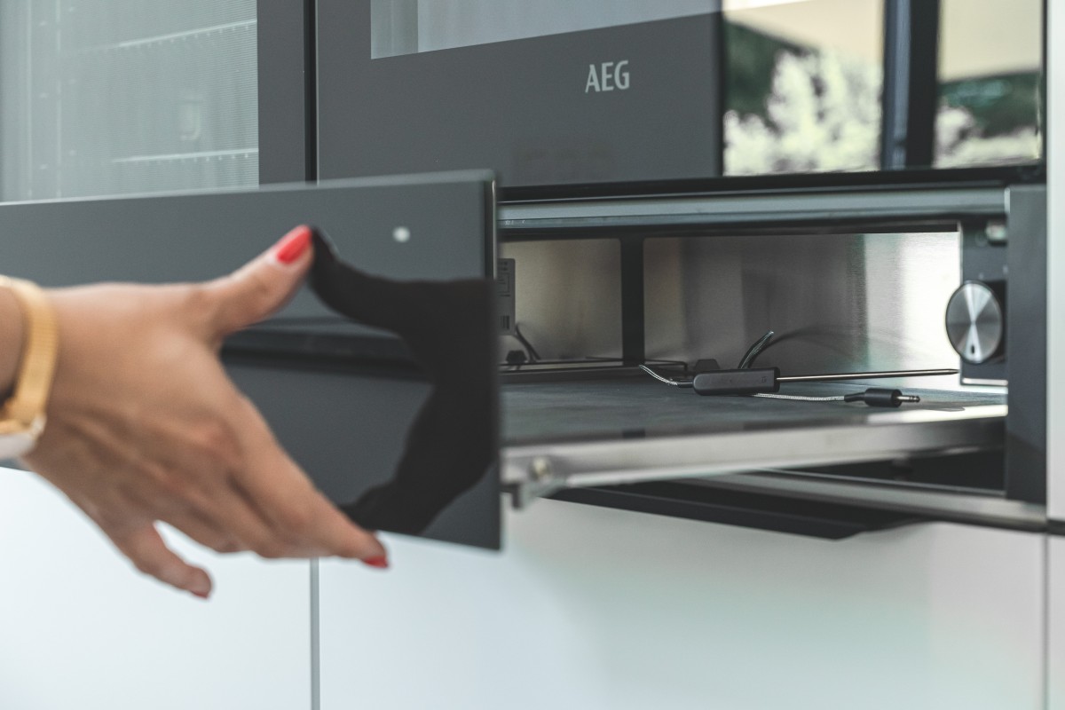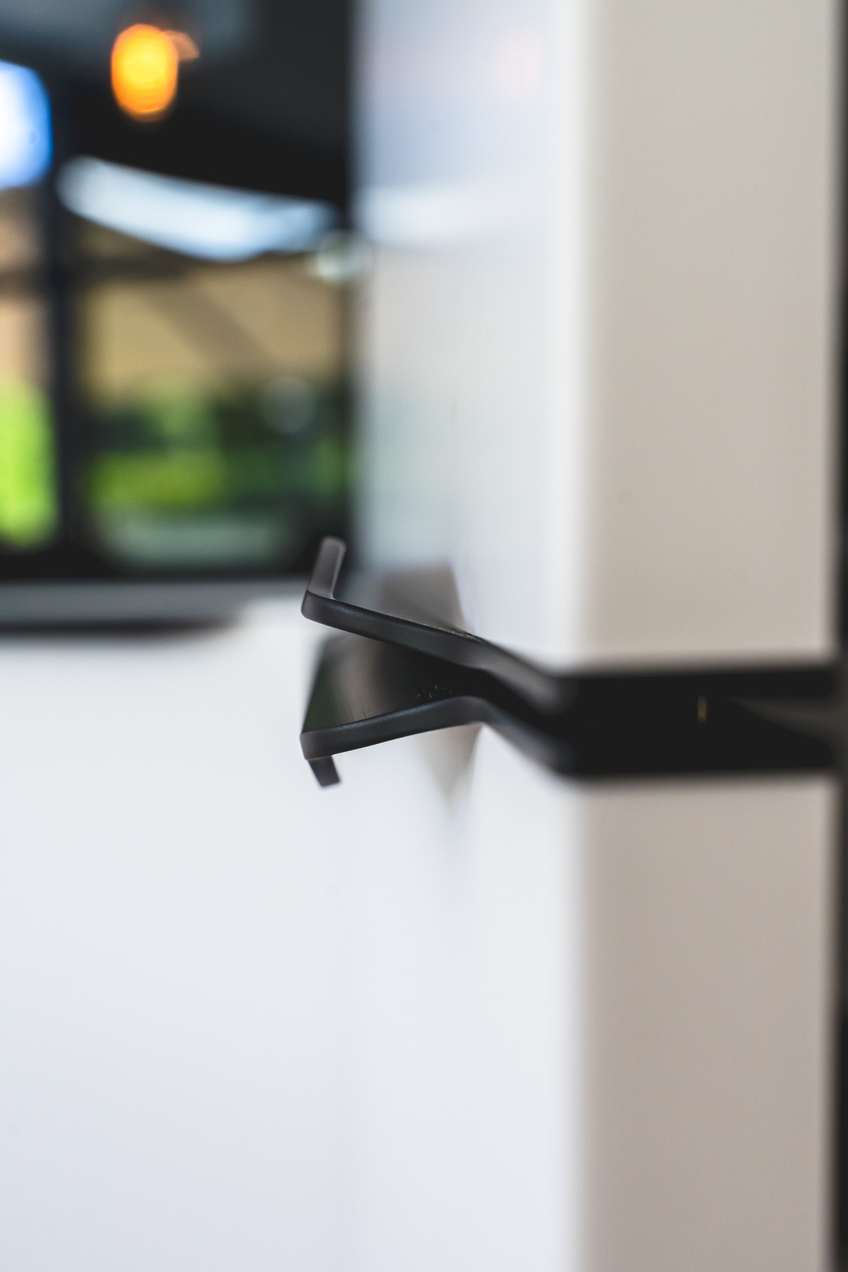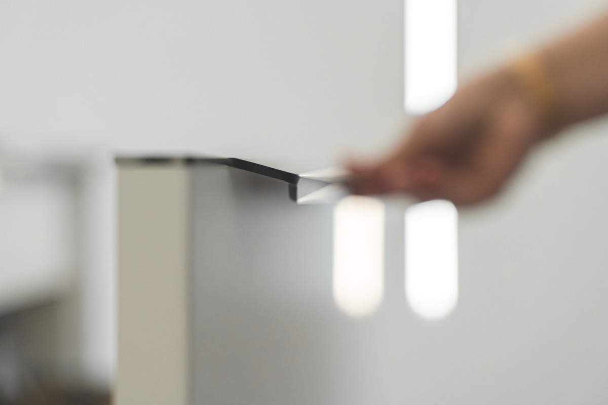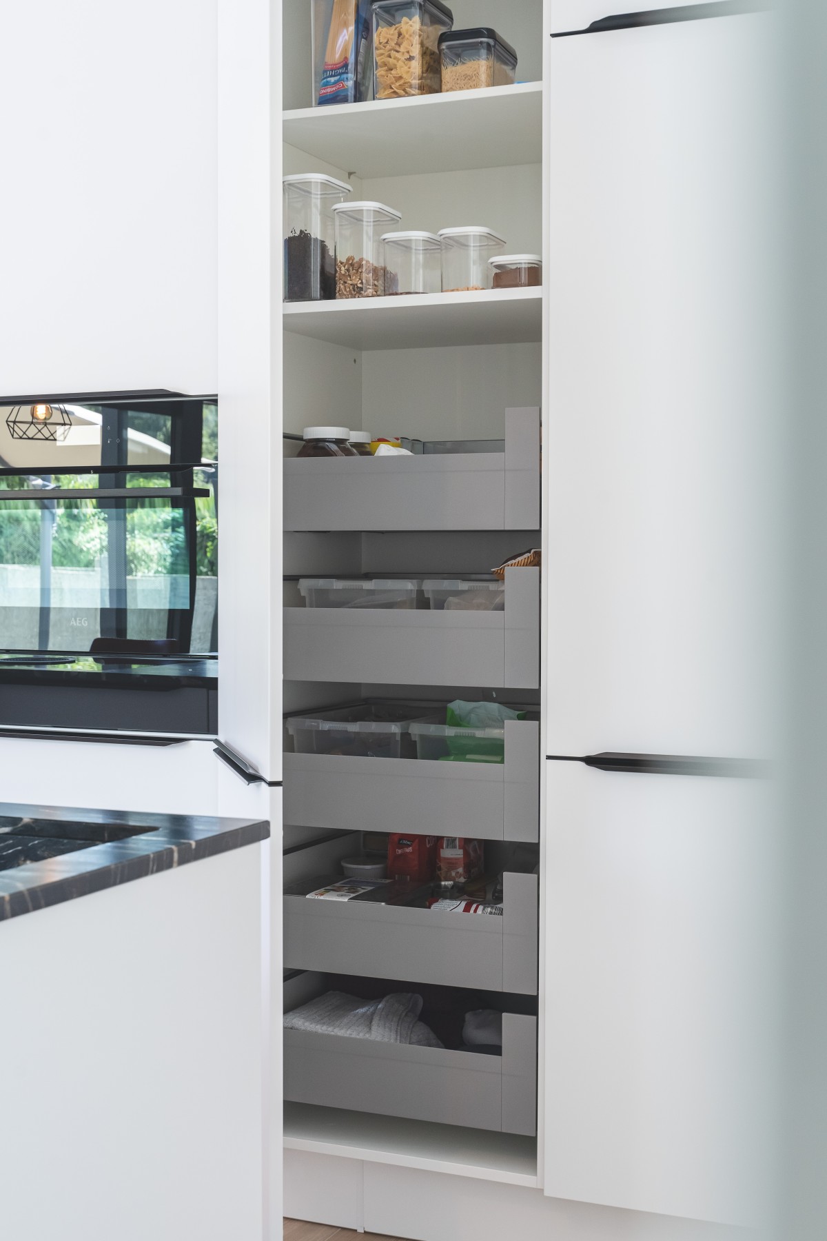 Sobriété et raffinement se rencontrent dans cette cuisine minimaliste, avec son plan en quartzite naturel et ses détails dorés qui illuminent l’espace